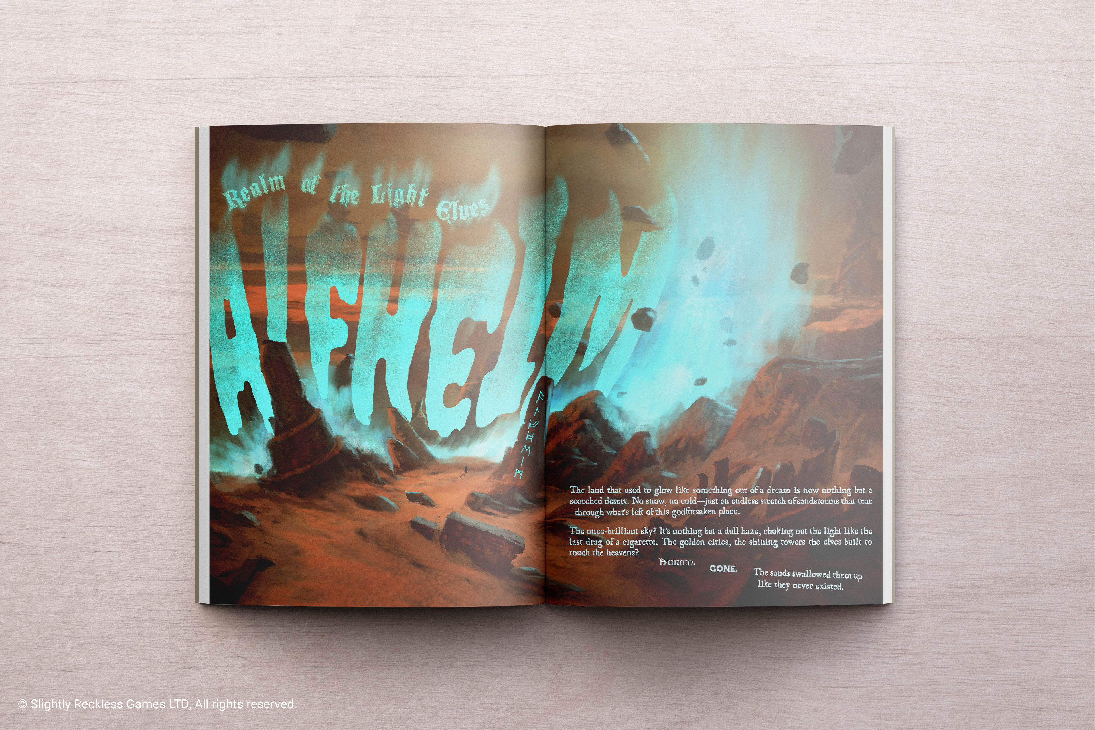 This is a collaborative work: While I was in charge of the illustration the layout, titles and texts are a work of Slightly Reckless Games on top of the base illustration I provided.